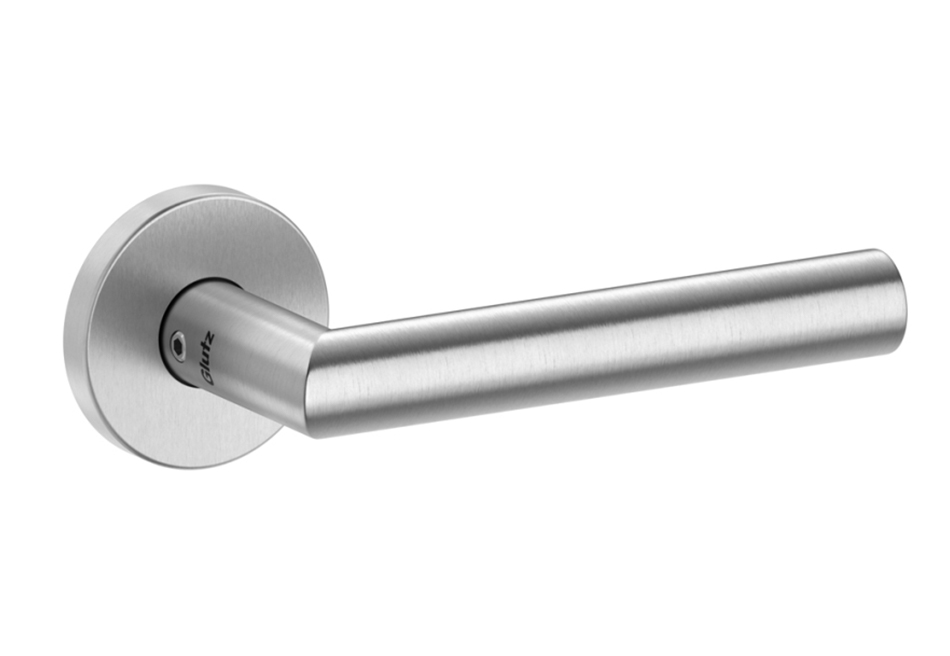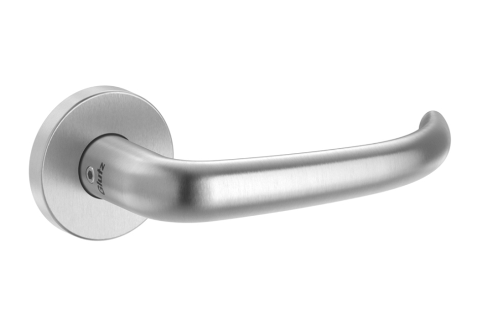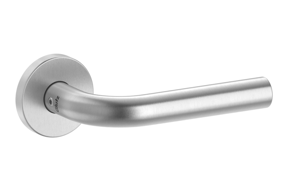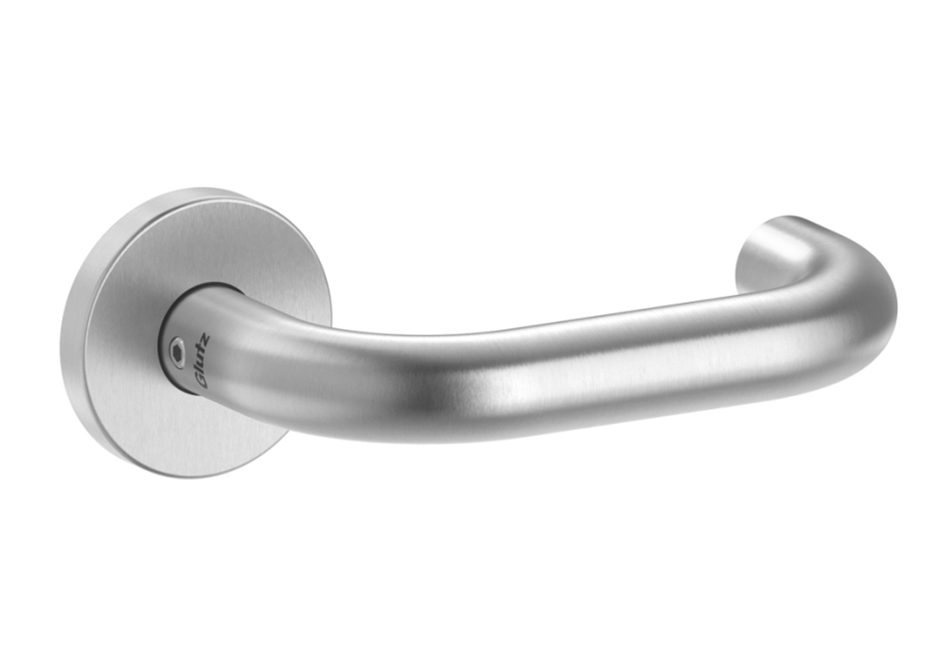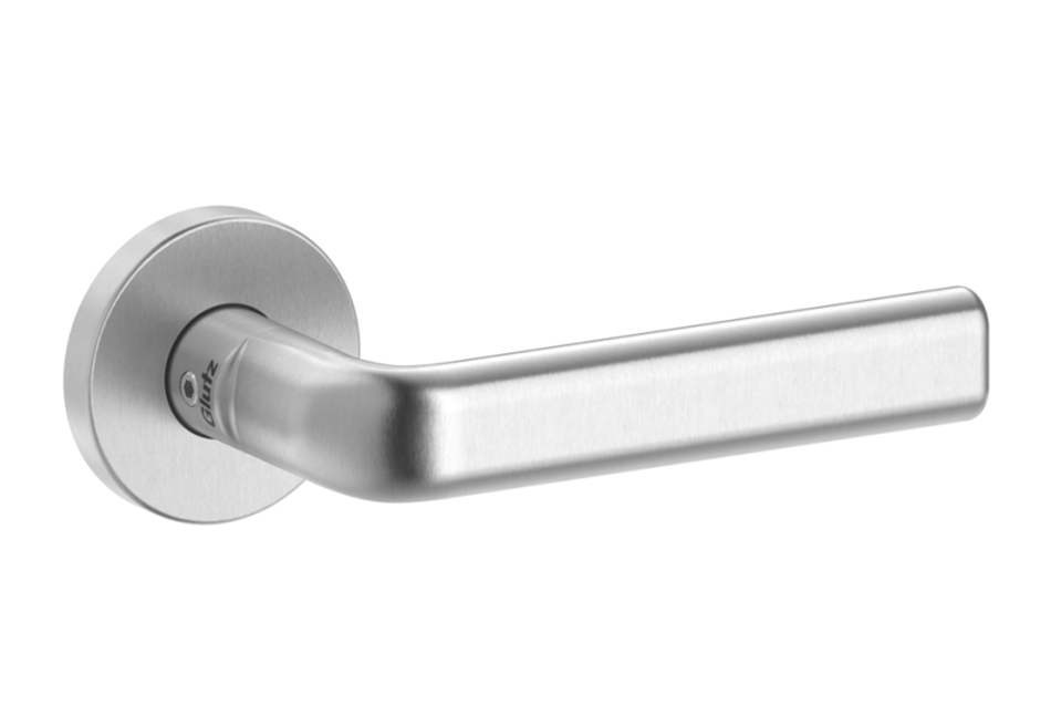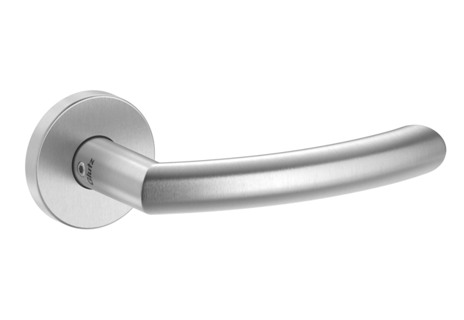 Unser Standard-Türdrücker ist die Glutz Topaz Serie. Zeitloses Design in Edelstahl matt, sechs Griffformen zur Auswahl. Frei kombinierbar mit Schildern oder Rosetten.
