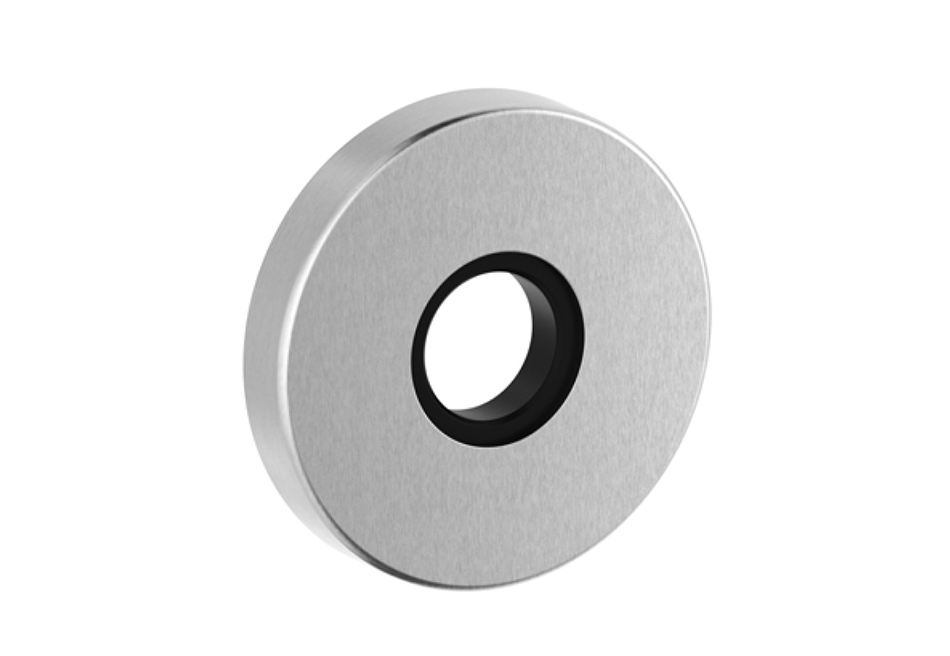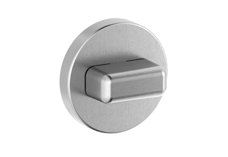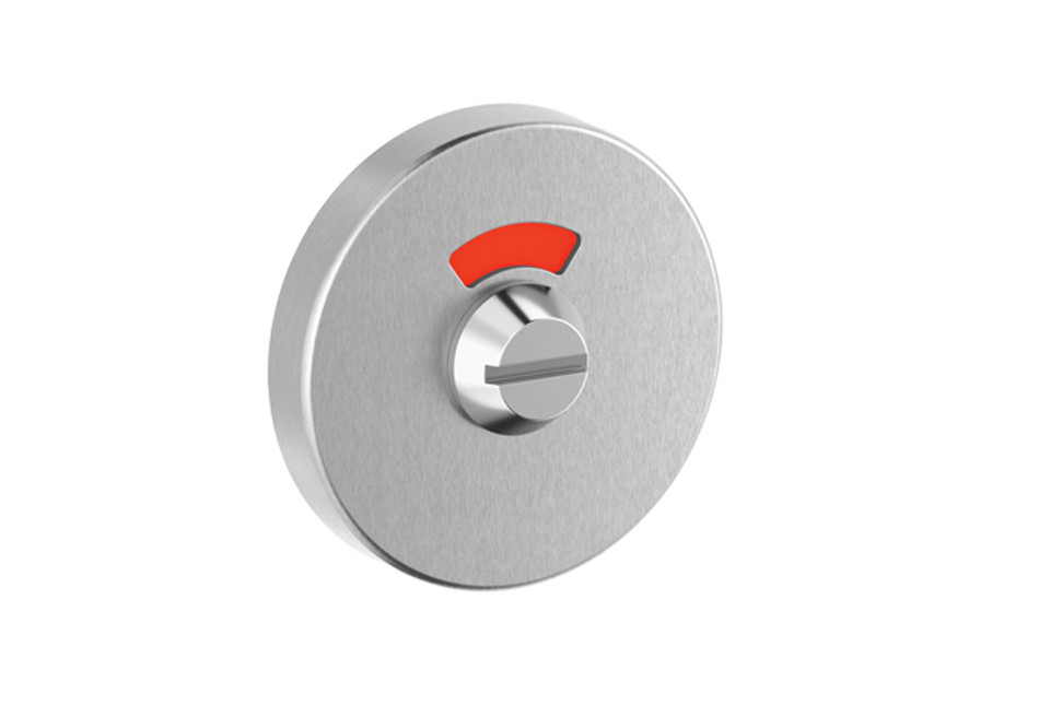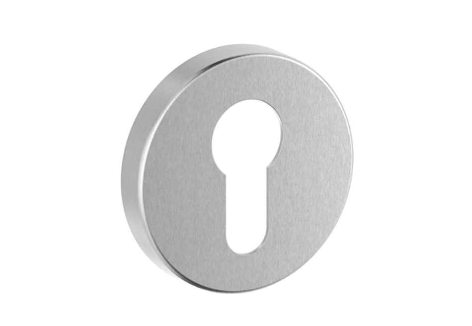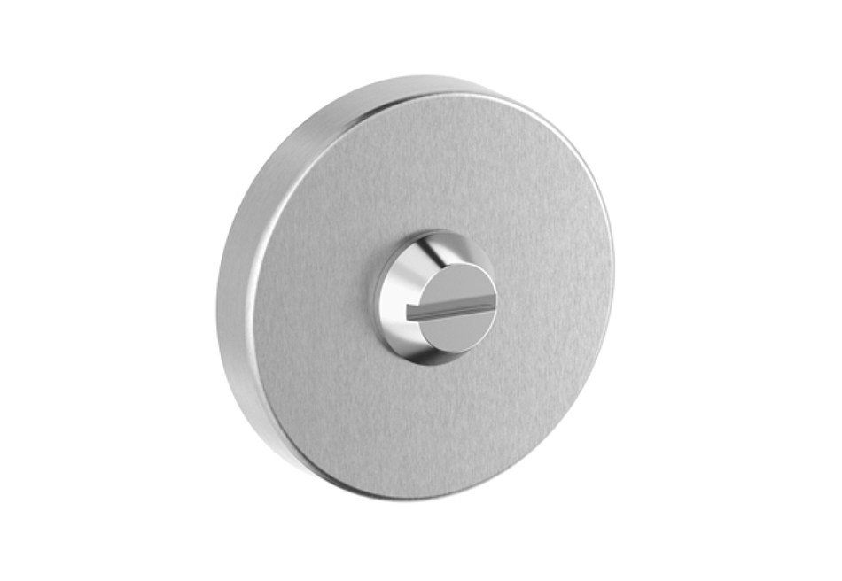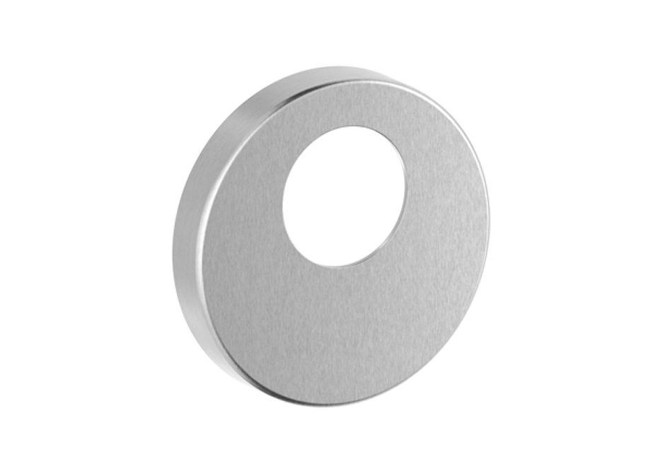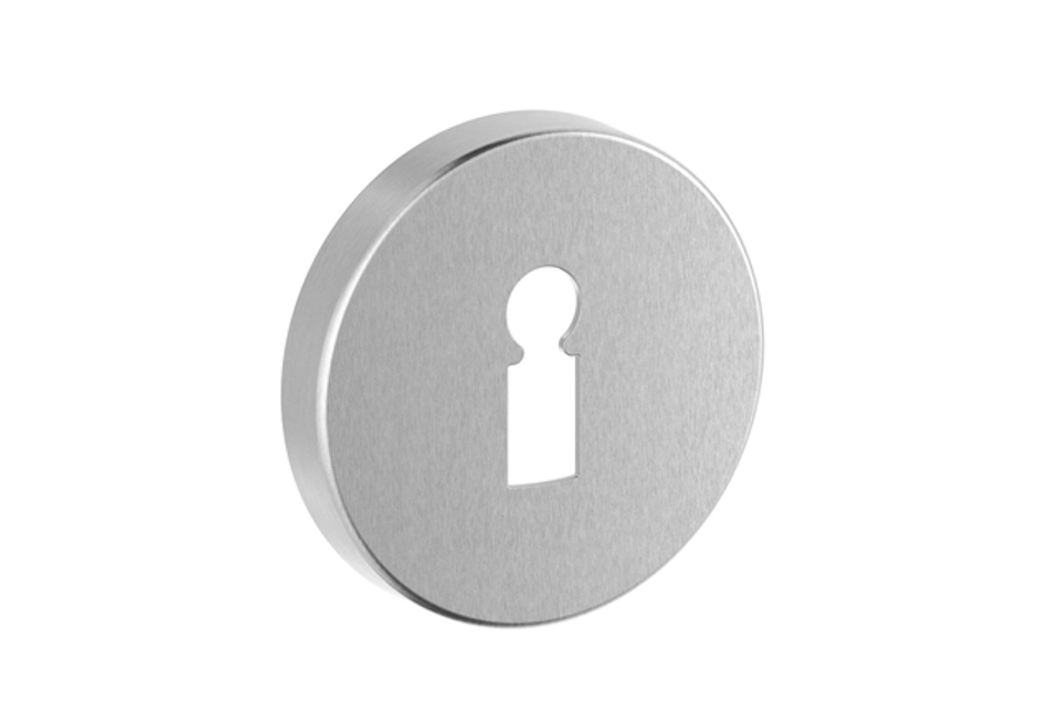 Runde Schlüsselrosette aus Edelstahl matt. Ø 53 mm, Höhe 8 mm. Montage mit Klippsystem auf Kunststoff-Grundplatte. Bildet zusammen mit der 5632C ein einheitliches Bild. Auch als WC-Rosette erhältlich, mit Drehknopf und rot/grün-Anzeige oder ohne Anzeige.